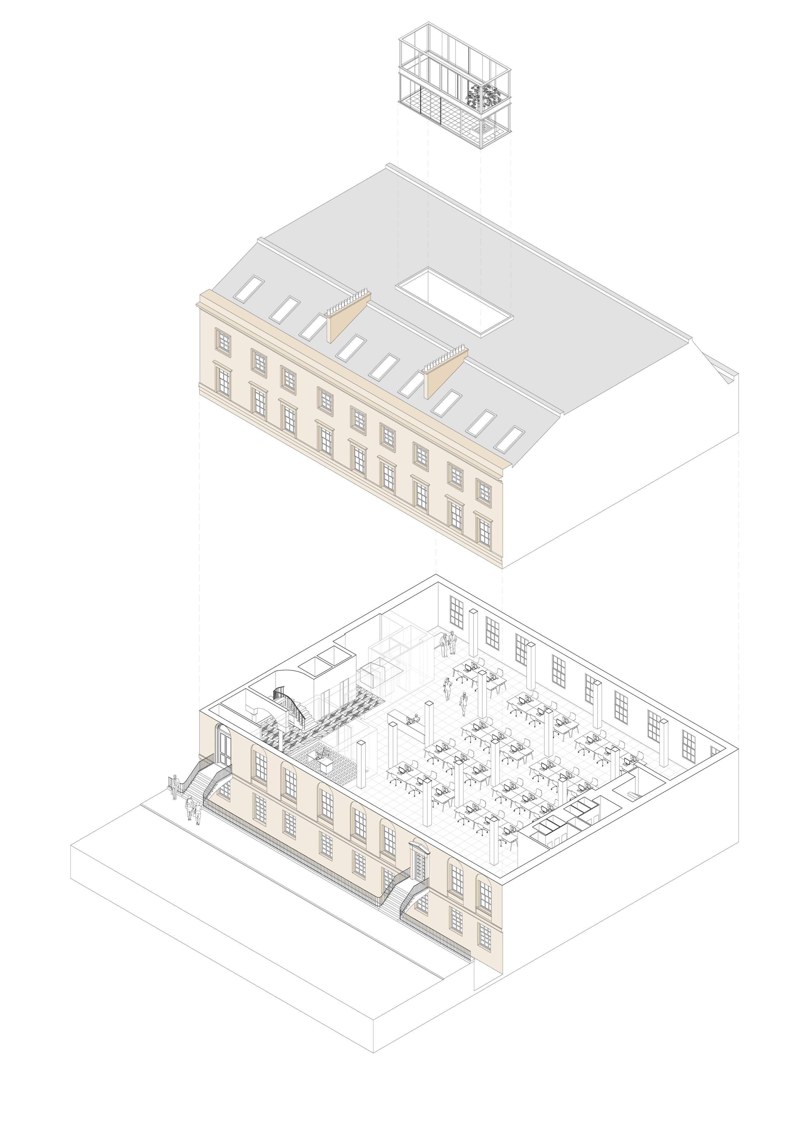 A strong visual hierarchy can be read within the building in terms scale, decoration and volume as you move from ground level to first floor and up through the building. To enhance these notions of thresholds, details and spatial qualities, to the upper floors the proposals introduce a new central glass ‘vitrine’ garden space to help offset the lower ceiling heights by providing opportunity for further natural light and air into the depths of the plan and office floor plate.